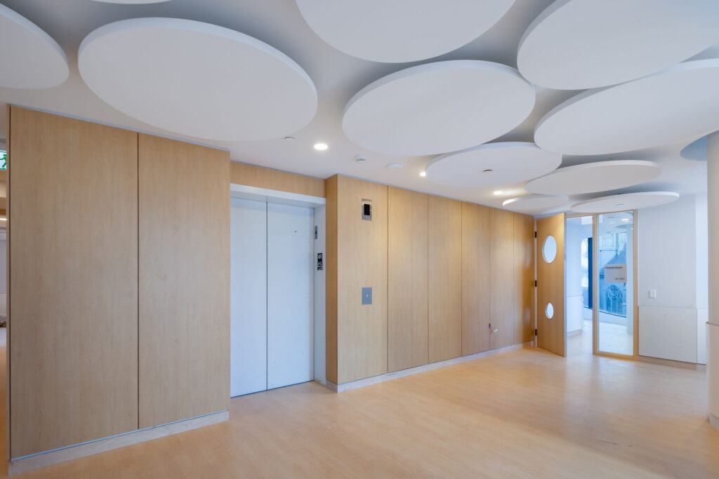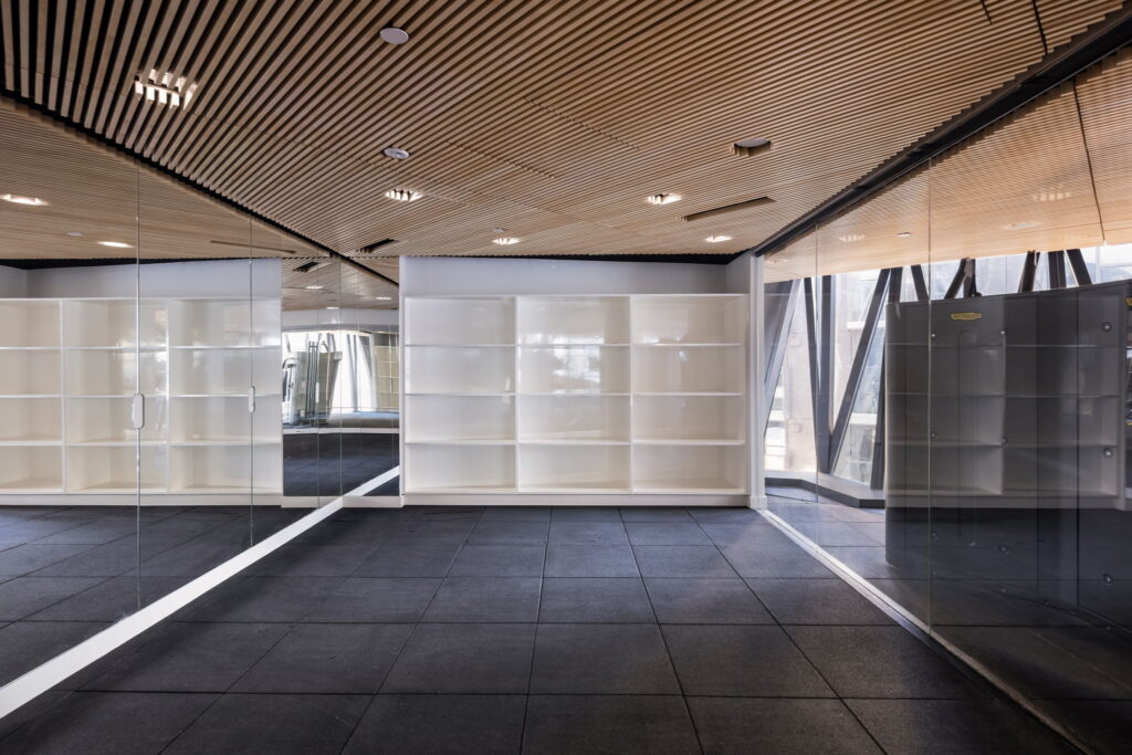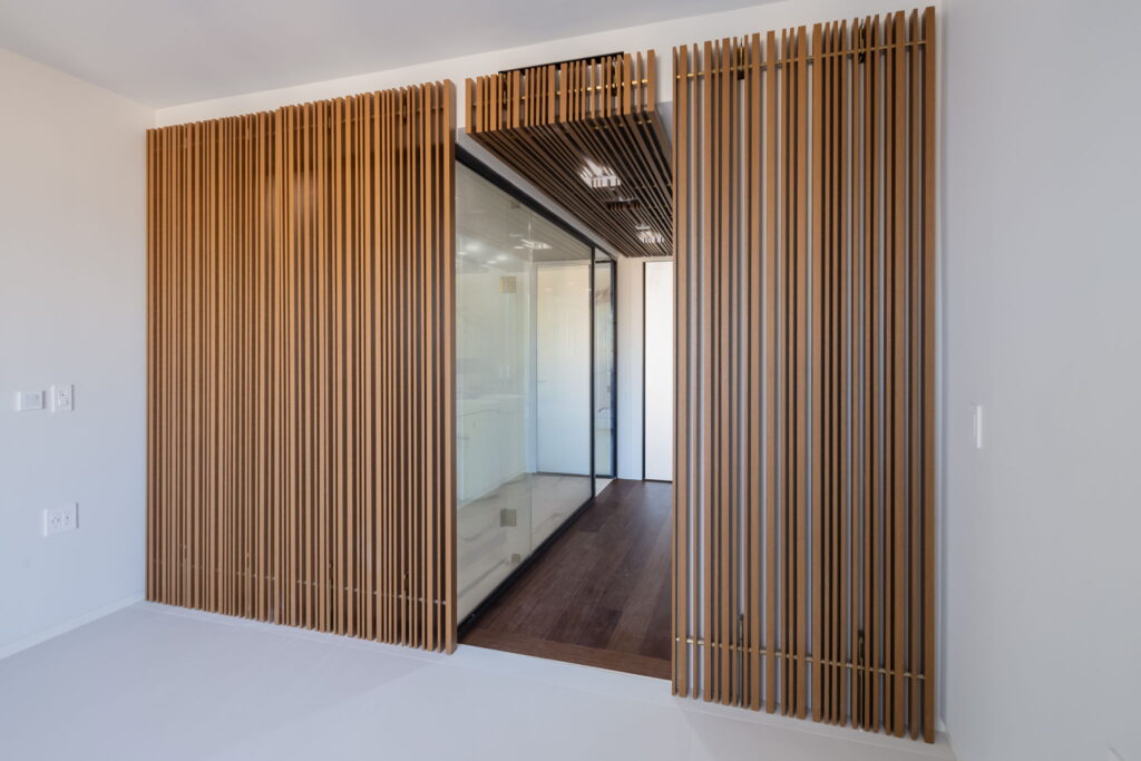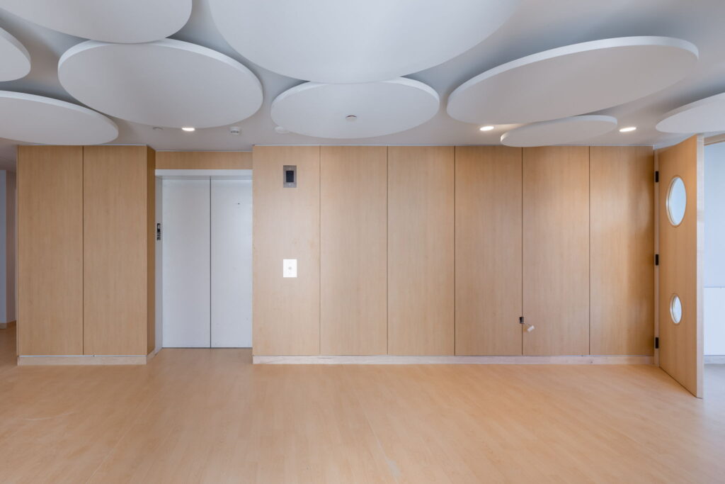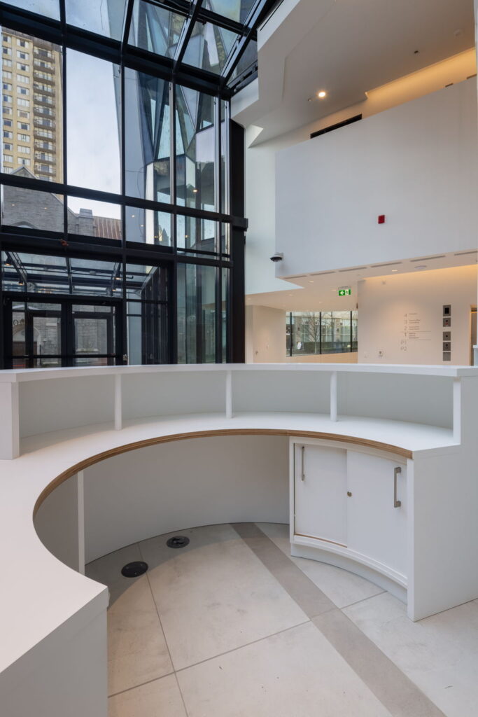 Our scope included custom millwork, wood wall paneling, metal elements, and integrated stone features. Signature highlights include curved wood veneer panels that echo the building’s flowing façade, precision-crafted cabinetry with concealed hardware, and stone-clad feature walls with brass detailing. Distinctive custom elements such as brushed metal trims and recessed lighting details reflect the elegance and complexity of the overall design.