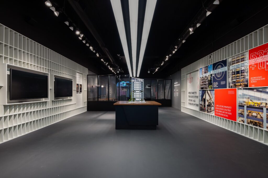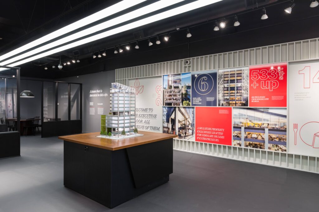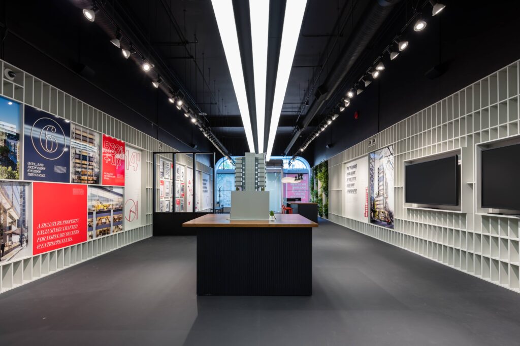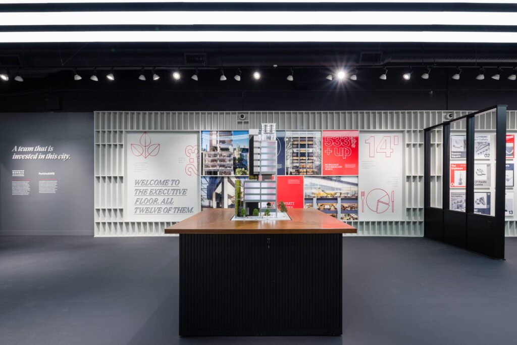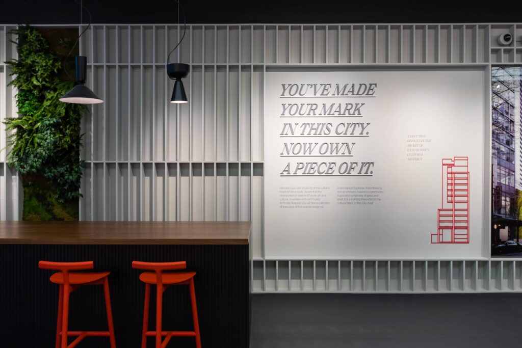 Presentation centre millwork for Profile Robson. Our scope included supply and install of all millwork which consisted of the reception desk, model bases, MDF and tambour wall paneling, banquet seating area, tables, and benches.