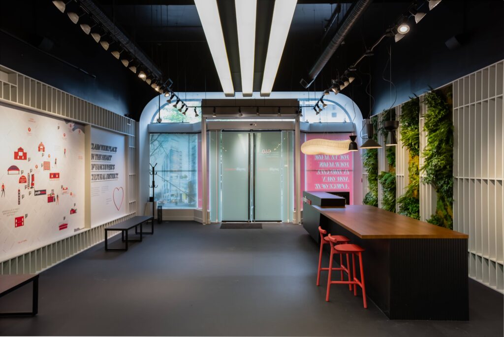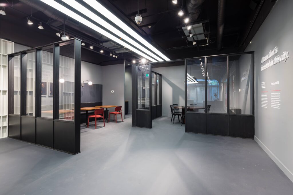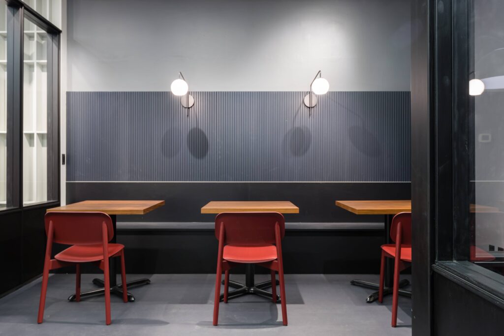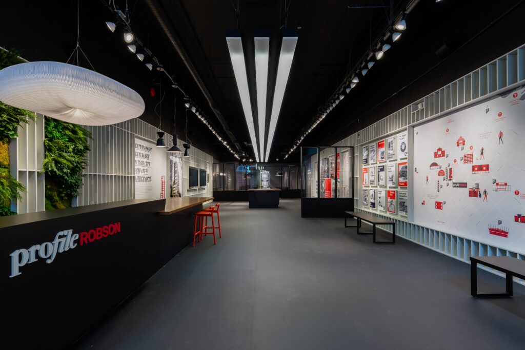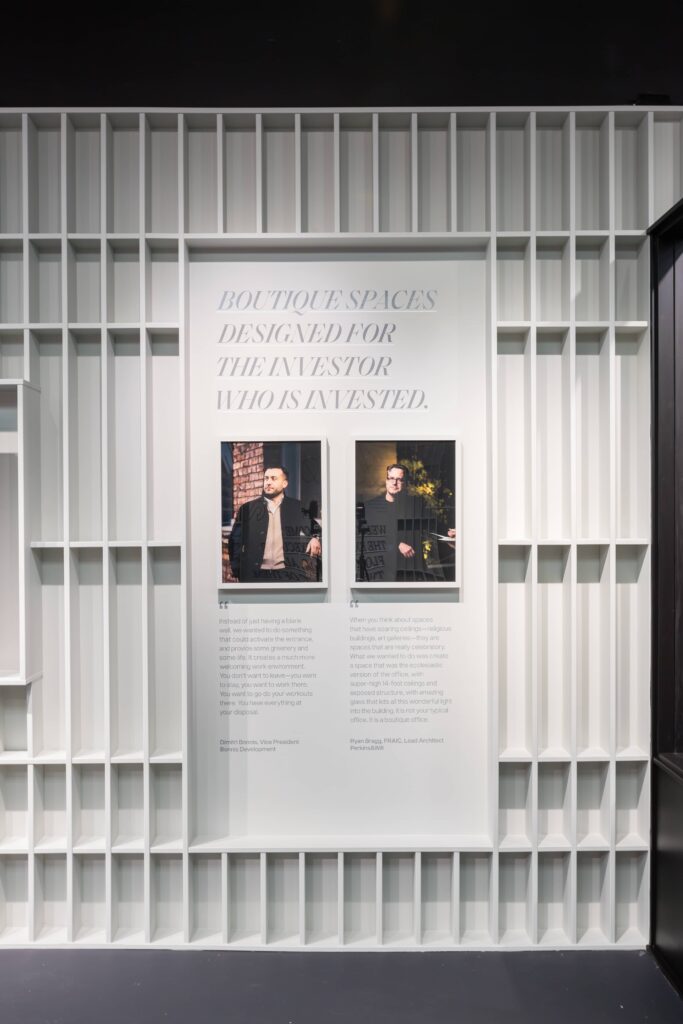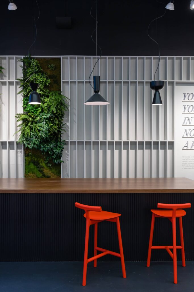 Presentation centre millwork for Profile Robson. Our scope included supply and install of all millwork which consisted of the reception desk, model bases, MDF and tambour wall paneling, banquet seating area, tables, and benches.